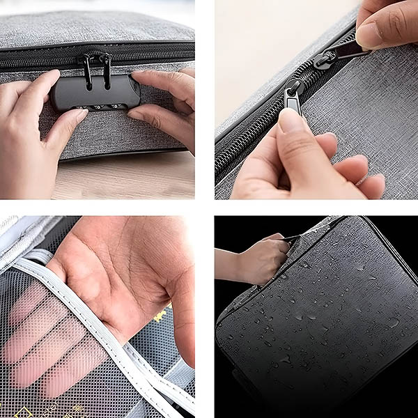 Ανησυχείτε για την ασφάλεια των σημαντικών εγγράφων και των τιμαλφών σας; Αυτή η αδιάβροχη τσάντα είναι εξοπλισμένη με μια ασφαλή κλειδαριά με κωδικό, διασφαλίζοντας ότι τα έγγραφα, τα χρήματα και τα κοσμήματά σας παραμένουν απρόσιτα σε άλλους.